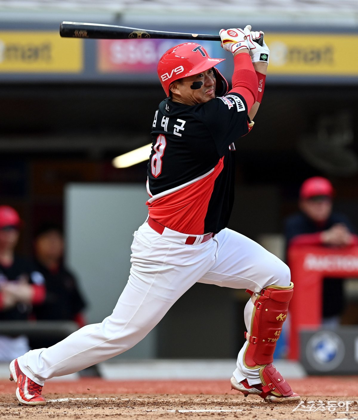 6일 인천 SSG 랜더스필드에서 ‘2023 신한은행 SOL KBO리그’ SSG 랜더스와 KIA 타이거즈의 경기가 열렸다. 2회초 2사 2루에서 KIA 김태군이 1타점 역전 2루타를 날리고 있다.