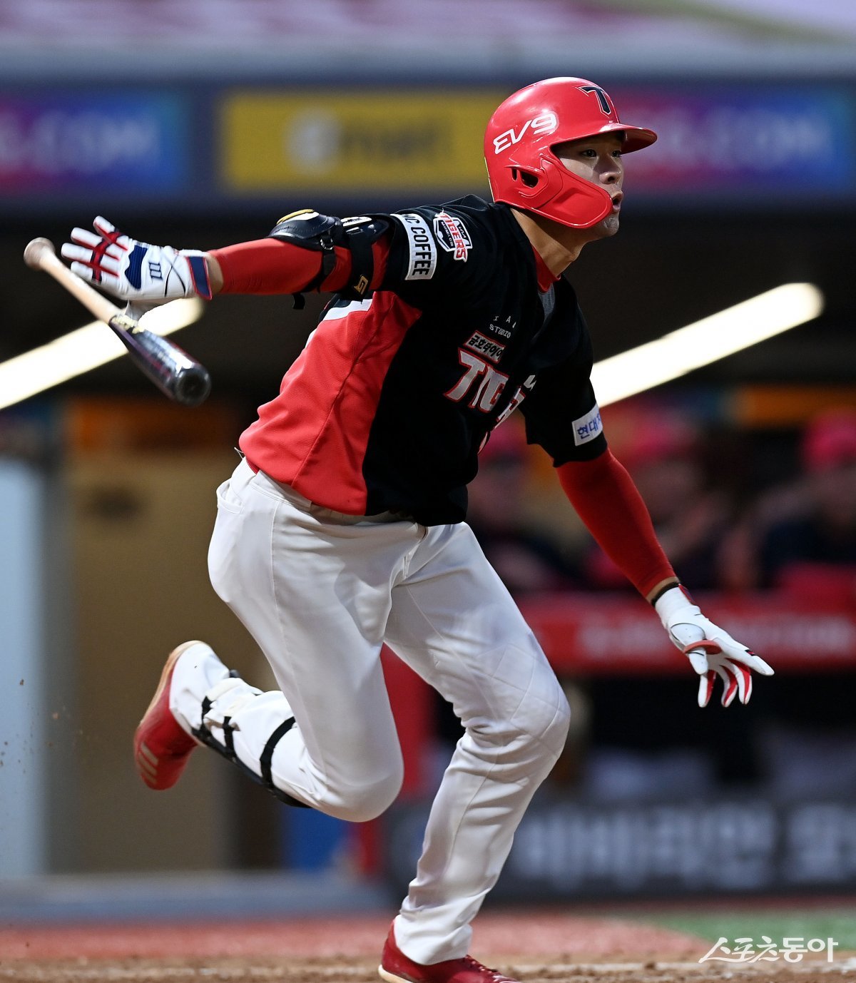 6일 인천 SSG 랜더스필드에서 ‘2023 신한은행 SOL KBO리그’ SSG 랜더스와 KIA 타이거즈의 경기가 열렸다. 4회초 1사 만루에서 KIA 김규성이 2타점 적시타를 날리고 있다.