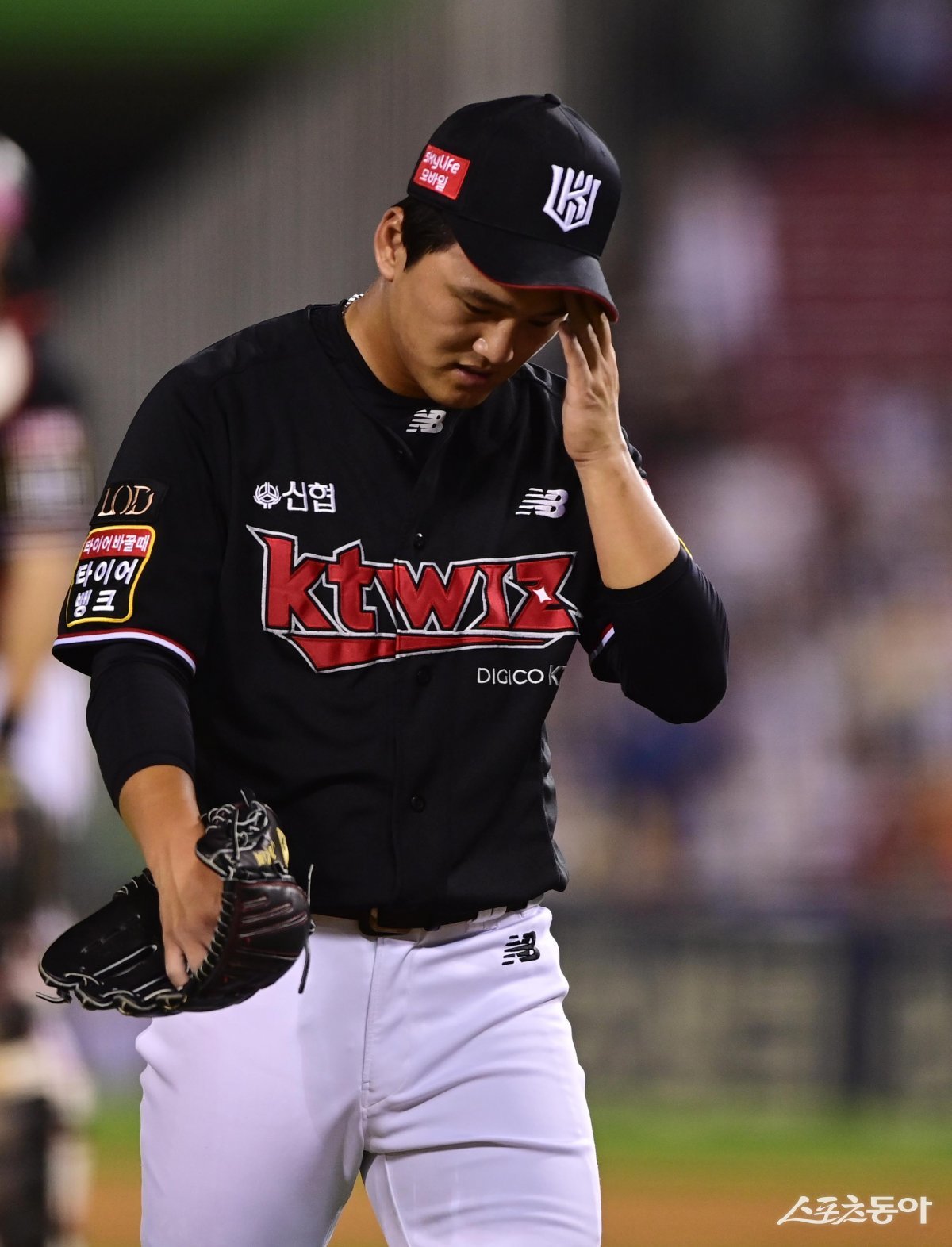 6일 서울 잠실야구장에서 열린 ‘2023 신한은행 SOL KBO리그’ LG 트윈스와 KT 위즈의 경기에서 6회말 2사 1, 3루 상황에서 KT 주권이 마운드를 내려가고 있다.