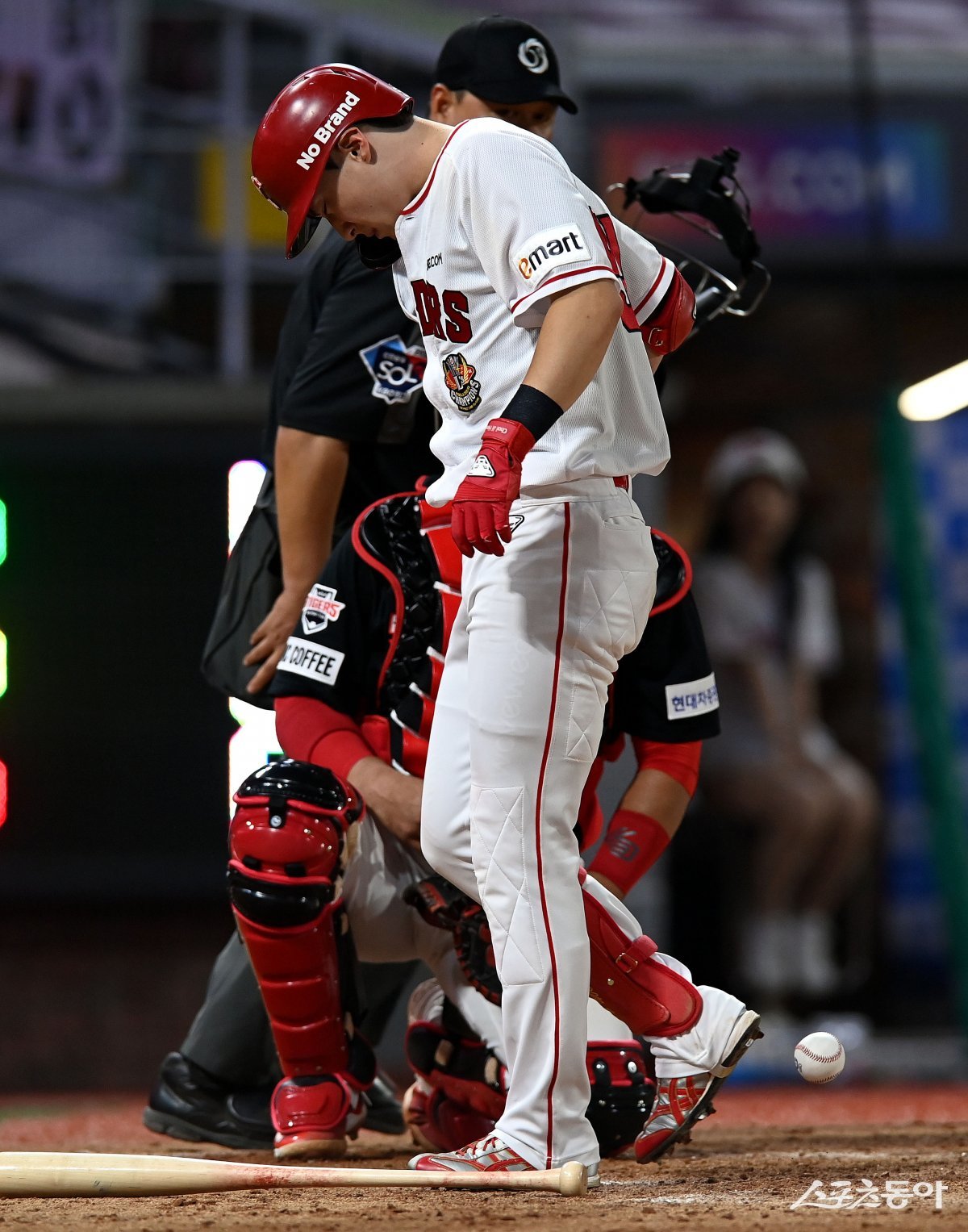 6일 인천 SSG 랜더스필드에서 ‘2023 신한은행 SOL KBO리그’ SSG 랜더스와 KIA 타이거즈의 경기가 열렸다. 8회말 1사 만루에서 SSG 최지훈이 투구에 맞아 고통을 호소하고 있다.