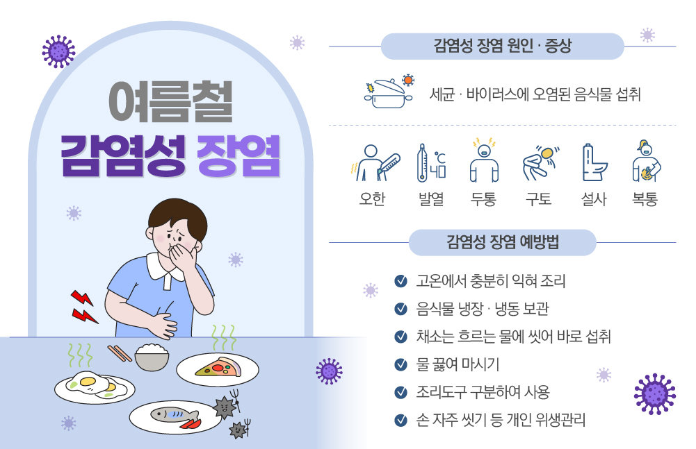 장염은 감염성 장염과 비감염성 장염으로 나눌 수 있는데, 여름철에는 어패류나 날 음식 등 음식물 섭취를 통한 감염성 장염이 기승을 부린다. 복통, 설사, 구토 등의 증상을 보인다. 보통은 수분섭취와 휴식을 통해 호전되기도 하지만 면역력이 약한 어린이나 고령자, 만성질환자 등은 증상이 쉽게 악화될 수 있어 정확한 진단과 치료를 받아야 한다.