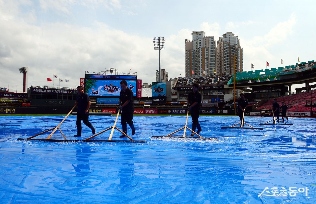 9일 경기도 수원 kt위즈파크에서 ‘2023 신한은행 SOL KBO리그’ kt 위즈와 KIA 타이거즈의 경기가 열린다. 경기 전 장맛비가 그치가 kt 관계자들이 그라운드를 정비하고 있다.