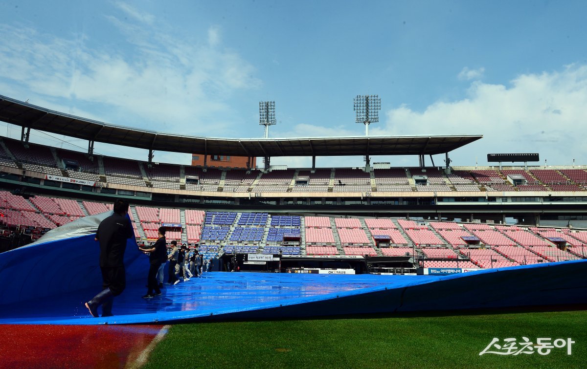 9일 경기도 수원 kt위즈파크에서 ‘2023 신한은행 SOL KBO리그’ kt 위즈와 KIA 타이거즈의 경기가 열린다. 경기 전 장맛비가 그치가 kt 관계자들이 그라운드를 정비하고 있다.