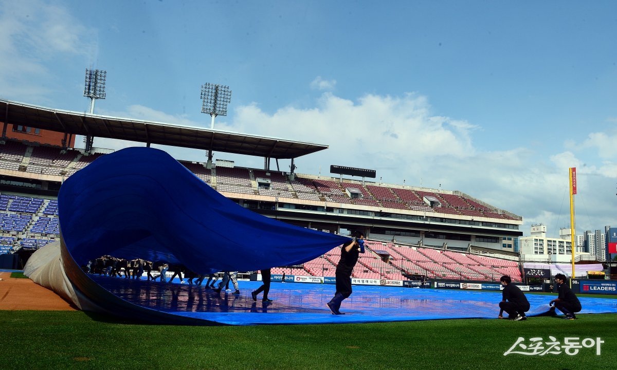 9일 경기도 수원 kt위즈파크에서 ‘2023 신한은행 SOL KBO리그’ kt 위즈와 KIA 타이거즈의 경기가 열린다. 경기 전 장맛비가 그치가 kt 관계자들이 그라운드를 정비하고 있다.