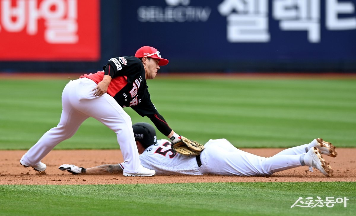 9일 경기도 수원 kt위즈파크에서 ‘2023 신한은행 SOL KBO리그’ kt 위즈와 KIA 타이거즈의 경기가 열렸다. 1회말 1사 1루에서 KIA 김선빈이 2루 도루를 시도하던 kt 김민혁을 태그 아웃 시키고 있다.