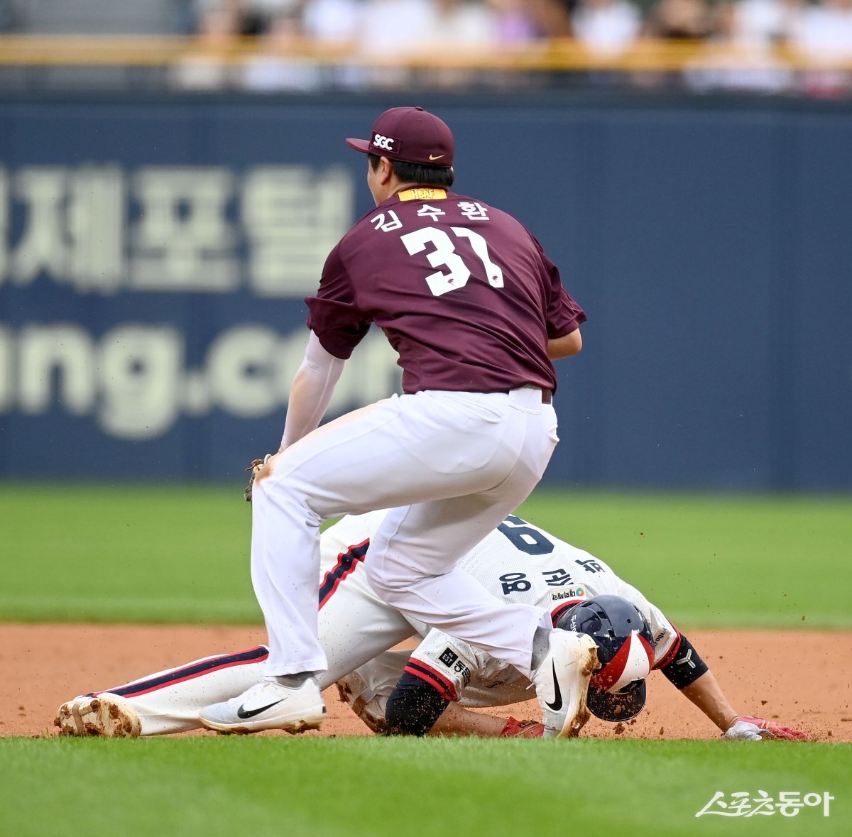9일 서울 잠실야구장에서 ‘2023 신한은행 SOL KBO리그’ 키움 히어로즈와 두산 베어스 경기가 열렸다. 2회말 2사 1루 상황에서 두산 1루주자 박준영이 협살에 걸려 태그를 피하고 있다.