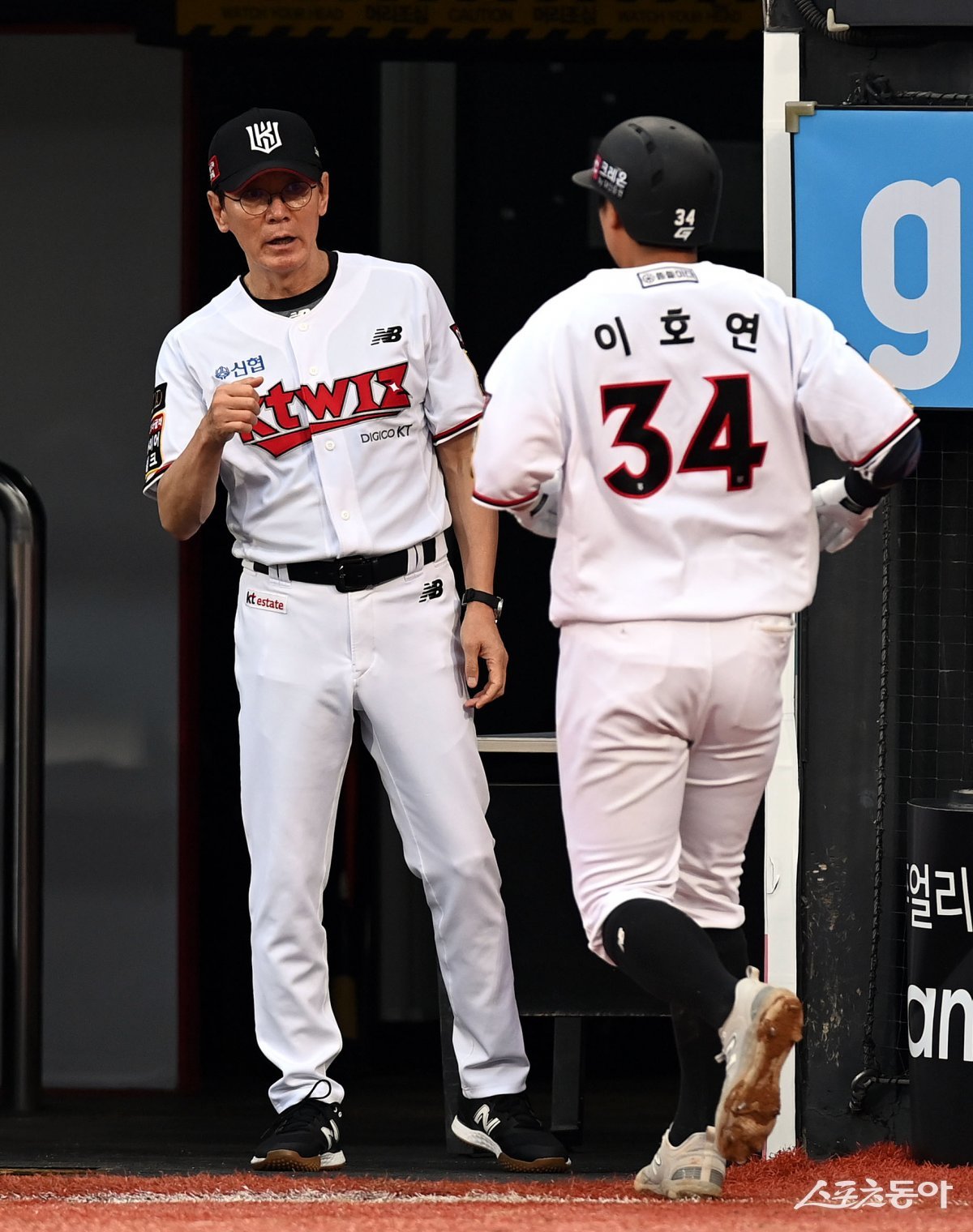 9일 경기도 수원 kt위즈파크에서 ‘2023 신한은행 SOL KBO리그’ kt 위즈와 KIA 타이거즈의 경기가 열렸다. 5회말 1사에서 kt 이호연이 솔로 홈런을 쏘아 올린 후 이강철 감독의 환영을 받고 있다.