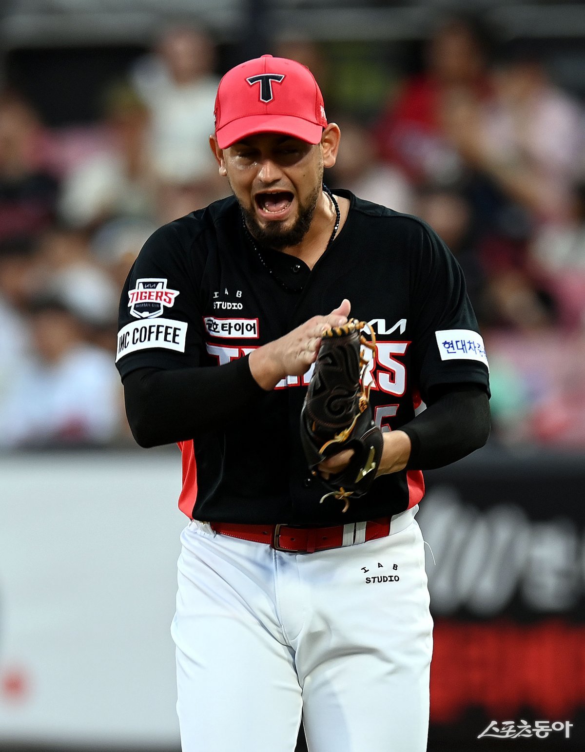 9일 경기도 수원 kt위즈파크에서 ‘2023 신한은행 SOL KBO리그’ kt 위즈와 KIA 타이거즈의 경기가 열렸다. 6회말 2사 1루에서 KIA 선발 산체스가 삼진 아웃으로 위기를 넘긴 후 환호하고 있다.