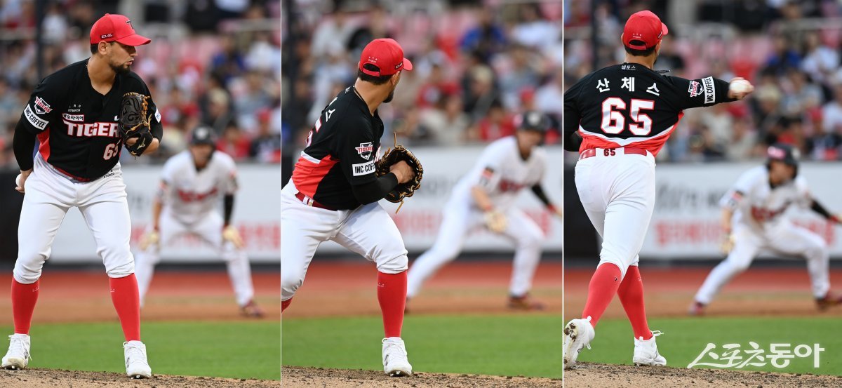 9일 경기도 수원 kt위즈파크에서 ‘2023 신한은행 SOL KBO리그’ kt 위즈와 KIA 타이거즈의 경기가 열렸다. 6회마 2사 1루에서 KIA 선발 산체스가 특이하게 1루로 견제하고 있다.