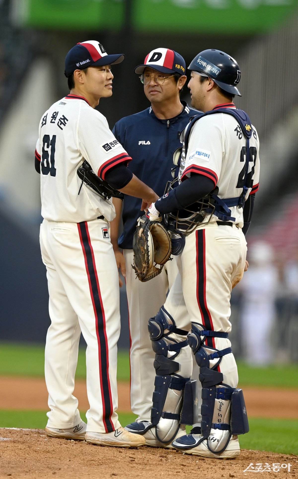 9일 서울 잠실야구장에서 ‘2023 신한은행 SOL KBO리그’ 키움 히어로즈와 두산 베어스 경기가 열렸다. 선발 투수로 등판한 두산 최원준이 5회초 연속 안타를 허용하자 궘영철 코치가 마운드에 올라 이야기하고 있다.