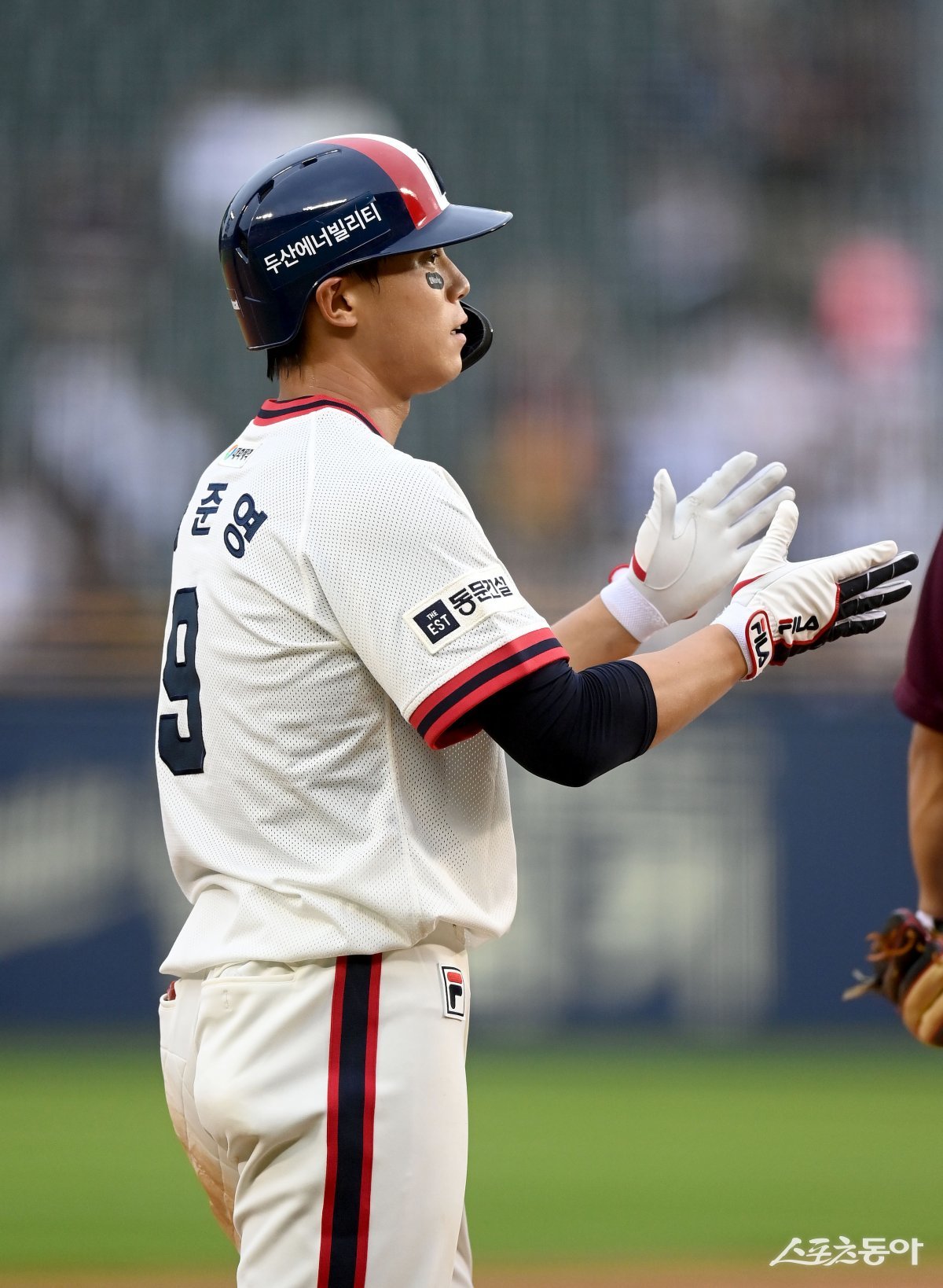 9일 서울 잠실야구장에서 ‘2023 신한은행 SOL KBO리그’ 키움 히어로즈와 두산 베어스 경기가 열렸다. 4회말 1사 1,2루 박준영이 2타점 좌전 3루타를 치고 3루에서 박수를 치고 있다.