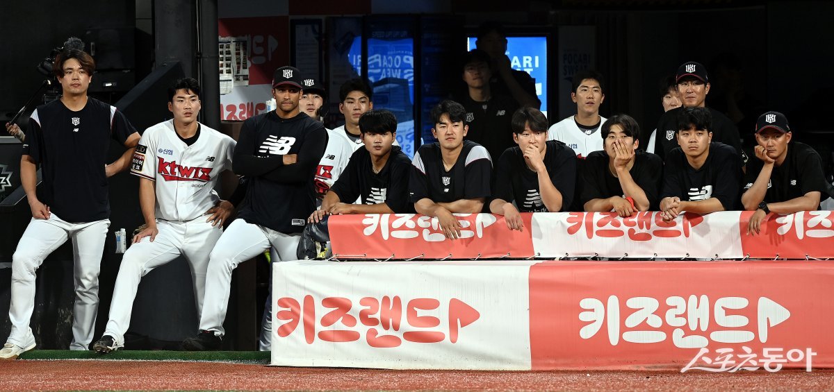 9일 경기도 수원 kt위즈파크에서 ‘2023 신한은행 SOL KBO리그’ kt 위즈와 KIA 타이거즈의 경기가 열렸다. KIA에 1-5로 뒤진 kt 9회말 마지막 공격 때 선수들이 경기를 지켜보고 있다.