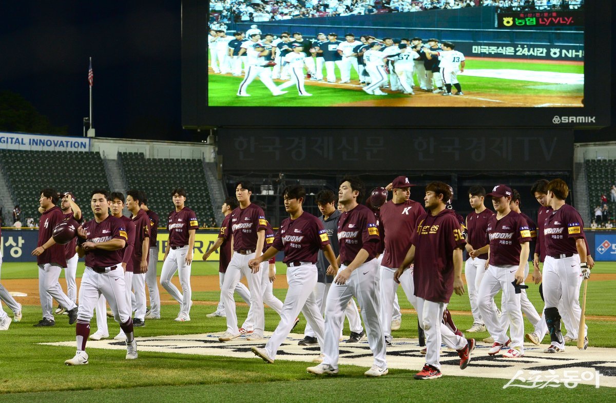 9일 서울 잠실야구장에서 ‘2023 신한은행 SOL KBO리그’ 키움 히어로즈와 두산 베어스 경기가 열렸다. 2-9로 패하며 4연패에 빠진 키움 선수들이 그라운드를 빠져나가고 있다.