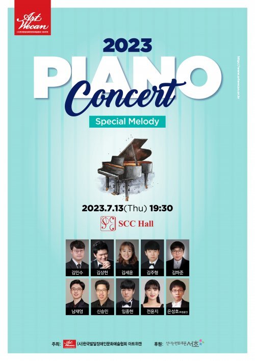 (사)한국발달장애인문화예술협회 아트위캔(이하 아트위캔, 대표 왕소영)이 7월 13일(목) 오후 7시 30분 서울 서초동 SCC Hall에서 서초구 사회복지기금 지원사업의 일환으로 ‘2023 피아노콘서트-스페셜 멜로디(Special Melody)’를 개최한다.