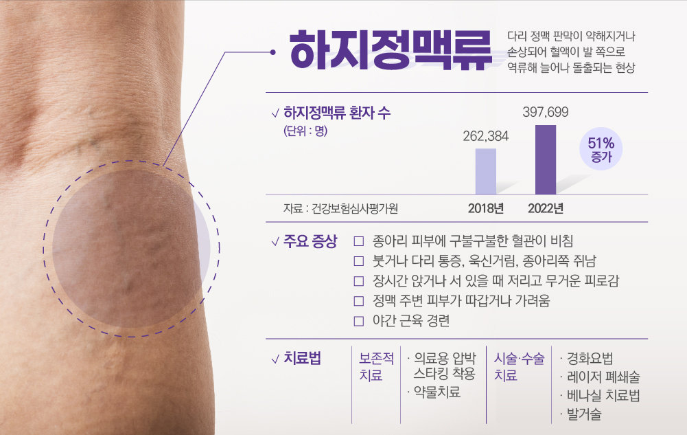 건강보험심사평가원에 따르면 하지정맥류로 병원을 찾은 환자수는 2022년 39만7699명으로 4년 전인 2018년 26만2384명에 비해 크게 증가했다. 특히 남성보다 여성환자가 2배 이상 많고, 40~60대 여성이 전체 환자의 70%이상을 차지하고 있다.