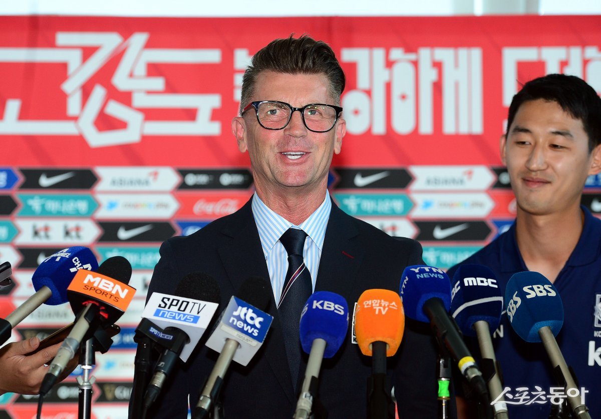 ‘2023 FIFA 호주-뉴질랜드 여자월드컵’에 출전하는 한국여자축구국가대표팀이 10일 인천국제공항을 통해 호주로 출국했다. 여자축구대표팀 콜린 벨 감독이 인터뷰를 하고 있다.