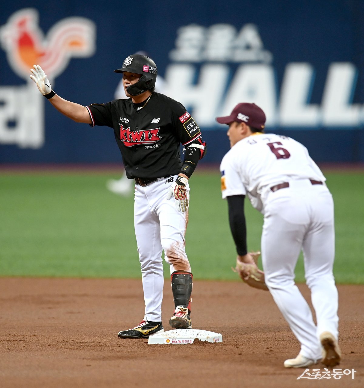 11일 서울 고척스카이돔에서 ‘2023 신한은행 SOL KBO리그’ KT 위즈와 키움 히어로즈 경기가 열렸다. 1회초 무사 1루 KT 김상수가 우전 2루타를 치고 2루에서 기뻐하고 있다.