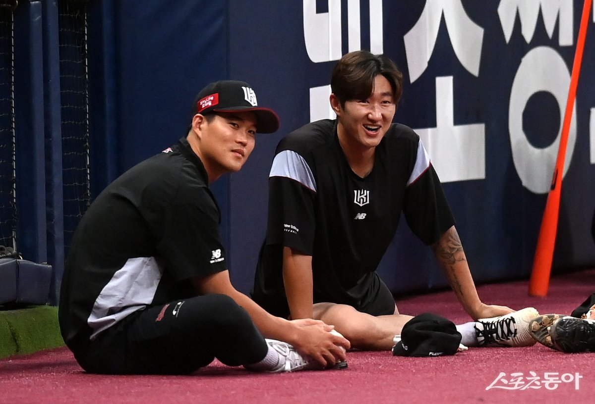 11일 서울 고척스카이돔에서 ‘2023 신한은행 SOL KBO리그’ KT 위즈와 키움 히어로즈 경기가 열린다. KT 배정대와 김민혁이 몸을 풀고 있다.