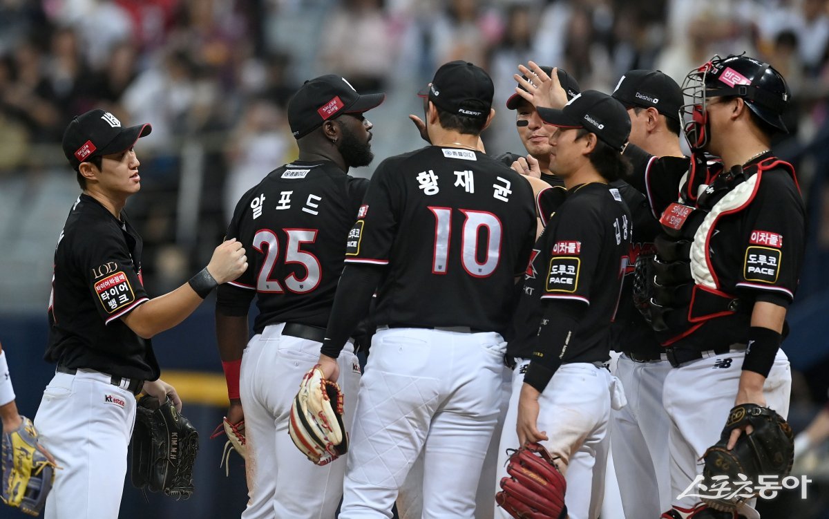 11일 서울 고척스카이돔에서 ‘2023 신한은행 SOL KBO리그’ KT 위즈와 키움 히어로즈 경기가 열렸다. 4-2 승리를 거두며 4연패에서 탈출한 KT 선수들이 하이파이브 하고 있다.