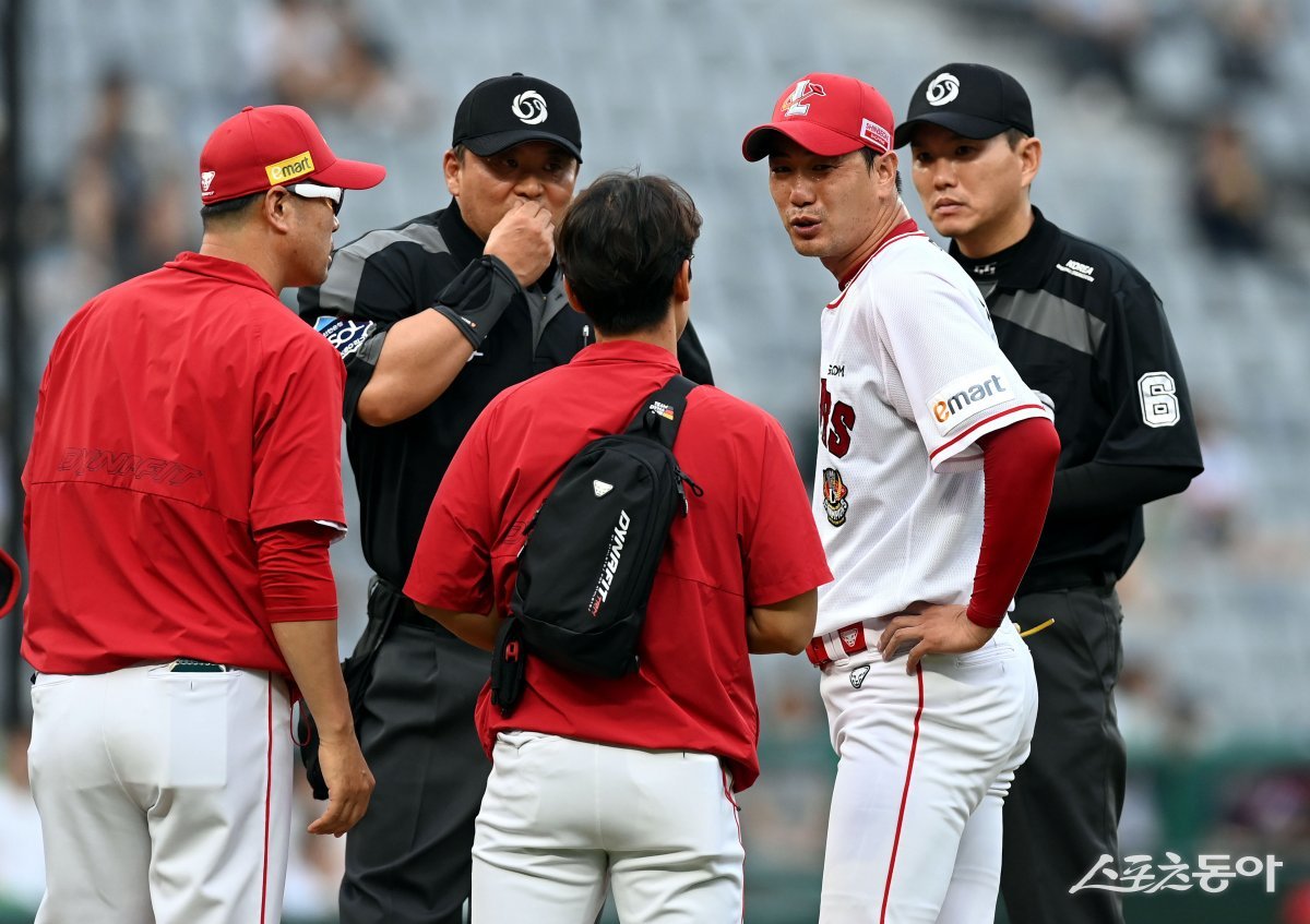 12일 인천 SSG 랜더스필드에서 ‘2023 신한은행 SOL KBO리그’ SSG 랜더스와 두산 베어스의 경기가 열렸다. 3회초 1사 1, 2루에서 SSG 선발 김광현이 수비를 펼치다 몸에 이상을 느껴 트레이너와 이야기를 나누고 있다.