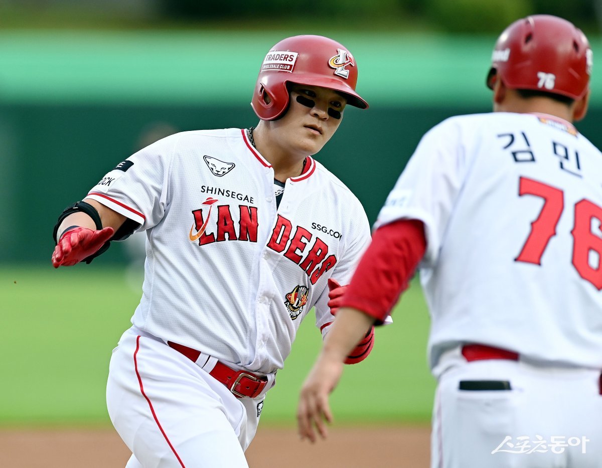 12일 인천 SSG 랜더스필드에서 ‘2023 신한은행 SOL KBO리그’ SSG 랜더스와 두산 베어스의 경기가 열렸다. 1회말 무사에서 SSG 추신수가 솔로 홈런을 쏘아 올린 후 그라운드를 돌며 코치의 환영을 받고 있다.