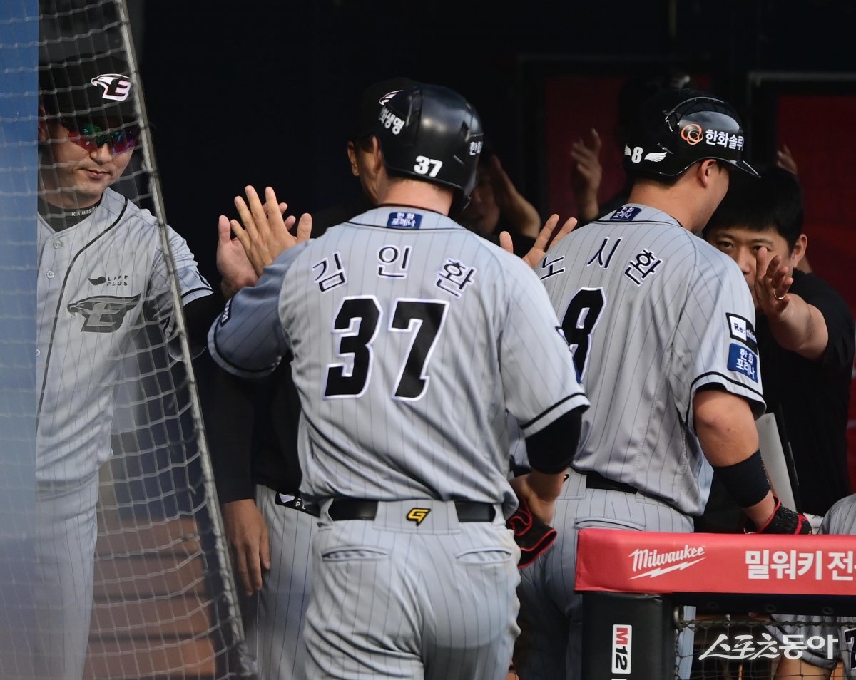 12일 서울 잠실야구장에서 열린 ‘2023 신한은행 SOL KBO리그’ LG 트윈스와 한화 이글스의 경기에서 1회초 2사 1, 2루 한화의 우전 적시타 때 득점에 성공한 1루주자 노시환과 2루주자 김인환이 최원호 감독의 축하를 받고 있다.