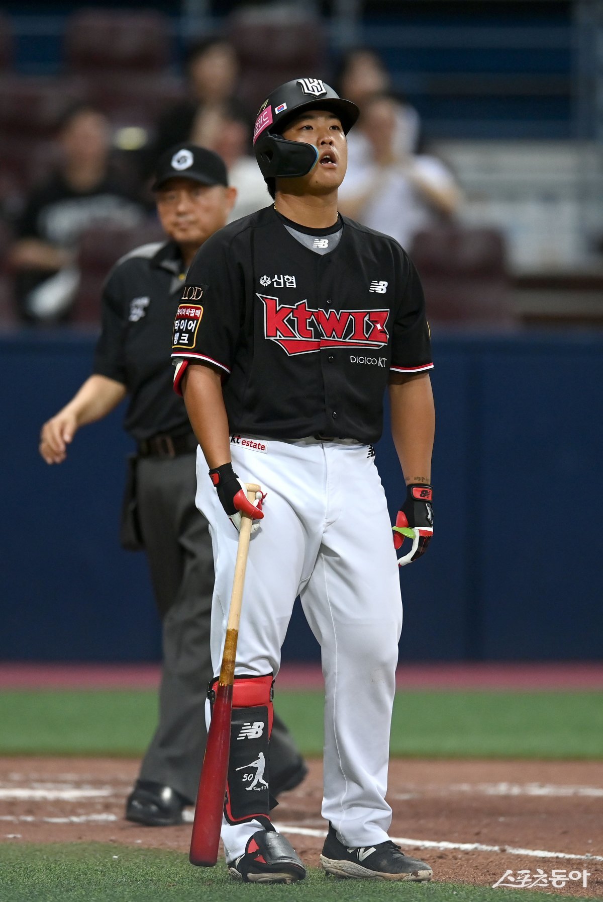 12일 서울 고척스카이돔에서 ‘2023 신한은행 SOL KBO리그’ KT 위즈와 키움 히어로즈 경기가 열렸다. 3회초 무사 1,2루 KT 강백호가 유격수 직선타로 아웃된 후 아쉬워하고 있다.