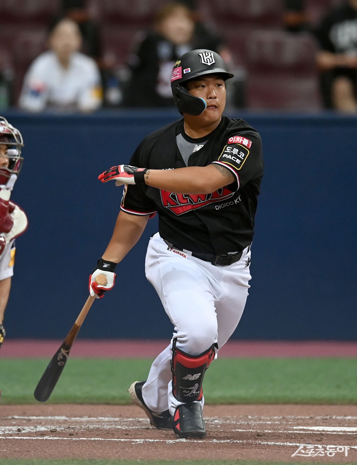 12일 서울 고척스카이돔에서 ‘2023 신한은행 SOL KBO리그’ KT 위즈와 키움 히어로즈 경기가 열렸다. 1회초 1사 1,2루 KT 강백호가 우전 안타를 치고 있다.