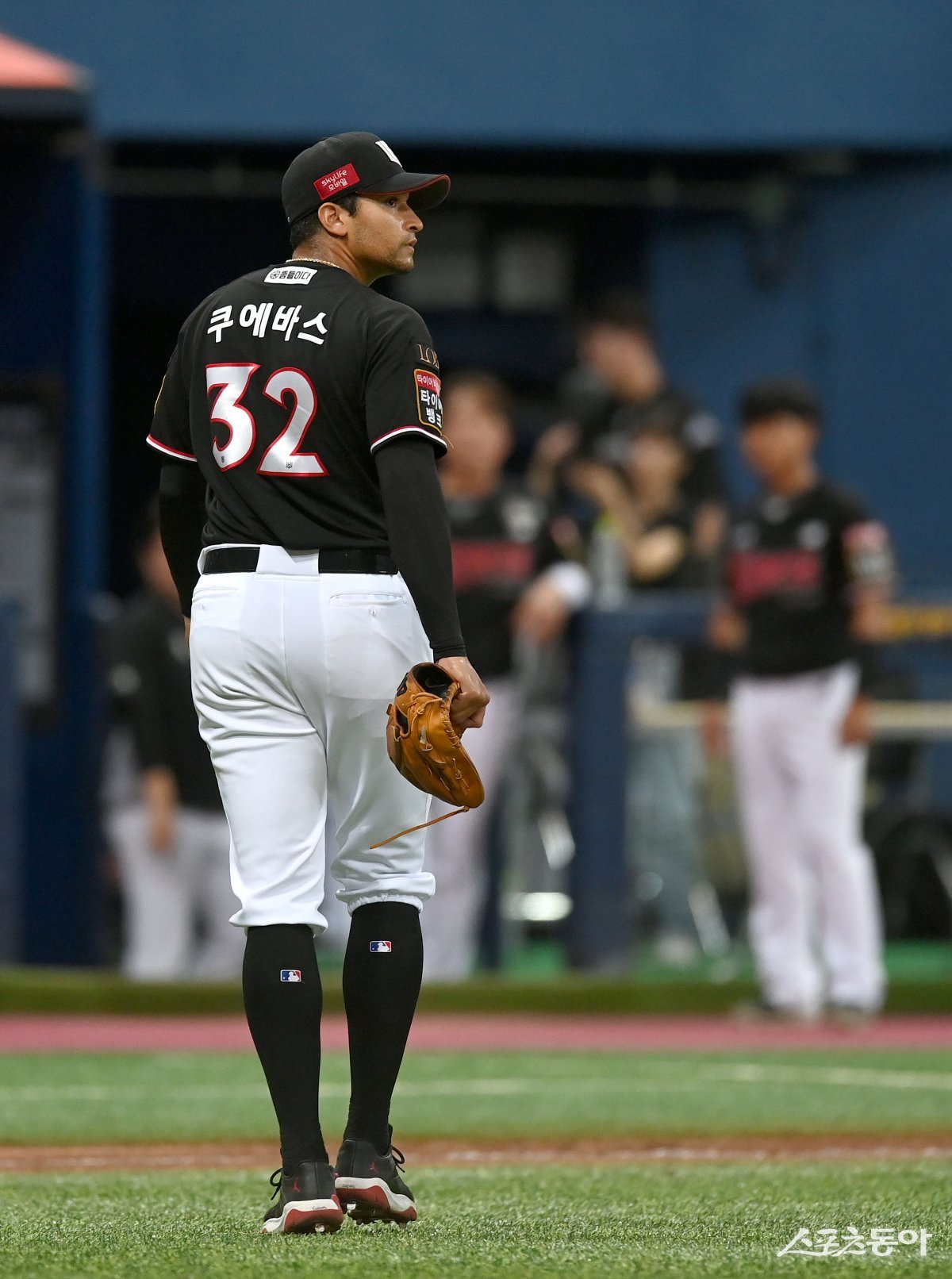 12일 서울 고척스카이돔에서 ‘2023 신한은행 SOL KBO리그’ KT 위즈와 키움 히어로즈 경기가 열렸다. 선발 투수로 등판한 KT 쿠에바스가 7회말 2사 2루 상황에서 교체되고 있다.