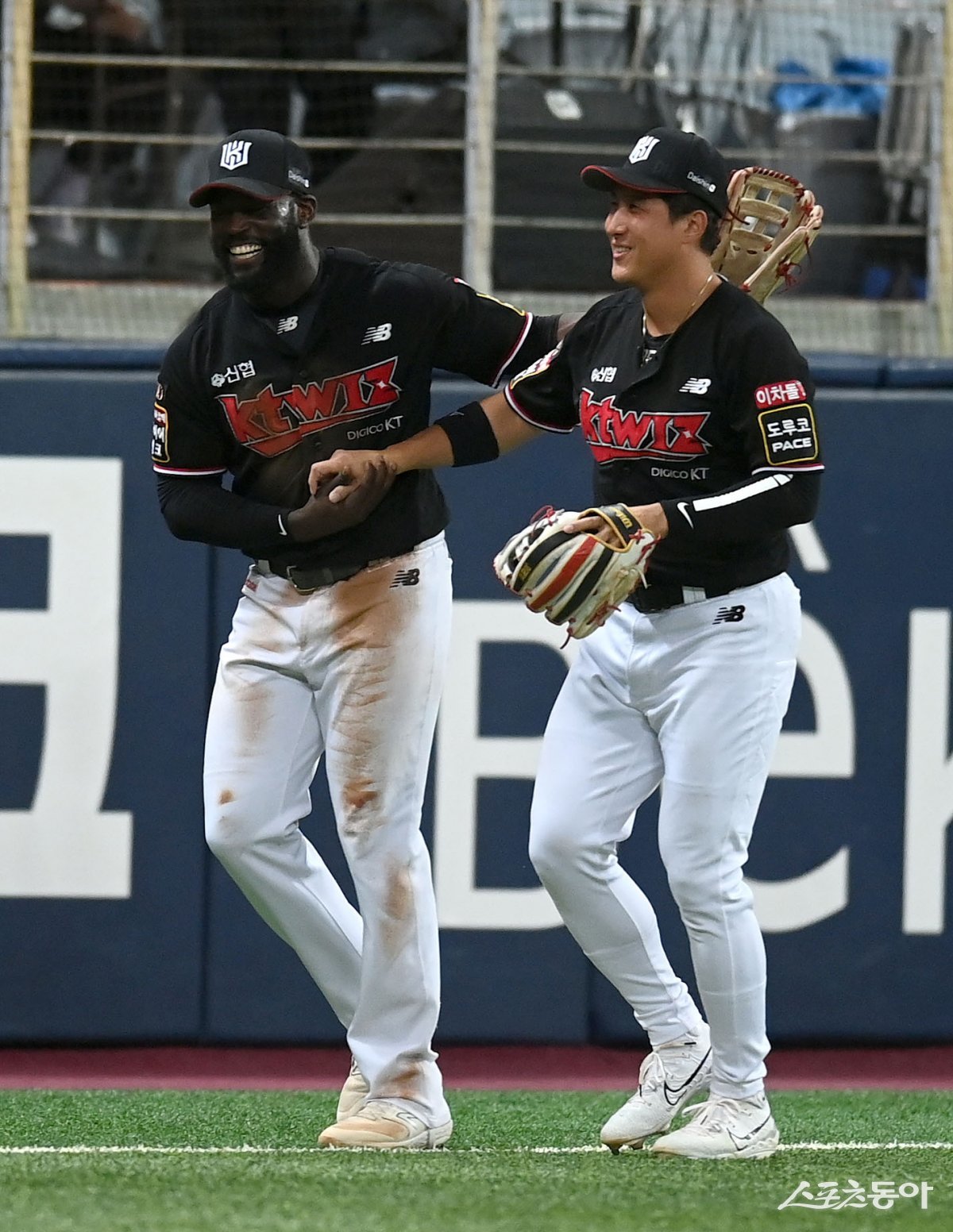 12일 서울 고척스카이돔에서 ‘2023 신한은행 SOL KBO리그’ KT 위즈와 키움 히어로즈 경기가 열렸다. 5회말 2사 KT 알포드가 뜬공을 잡다 넘어진 황재균을 일으켜주고 있다.