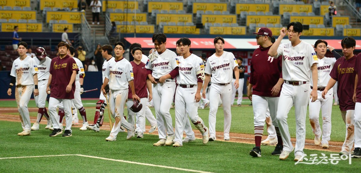 12일 서울 고척스카이돔에서 ‘2023 신한은행 SOL KBO리그’ KT 위즈와 키움 히어로즈 경기가 열렸다. 3-4로 패하며 6연패에 빠진 키움 선수들이 더그아웃으로 들어가고 있다.
