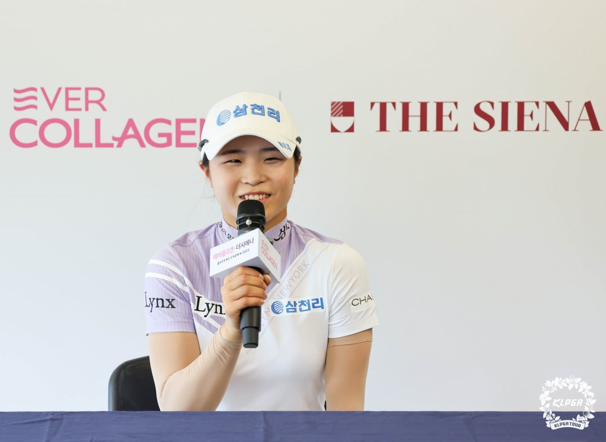 고지원이 ‘에버콜라겐·더시에나 퀸즈크라운 2023’ 1라운드를 8언더파 단독 1위로 마친 뒤 소감을 밝히고 있다. 사진제공 | KLPGA