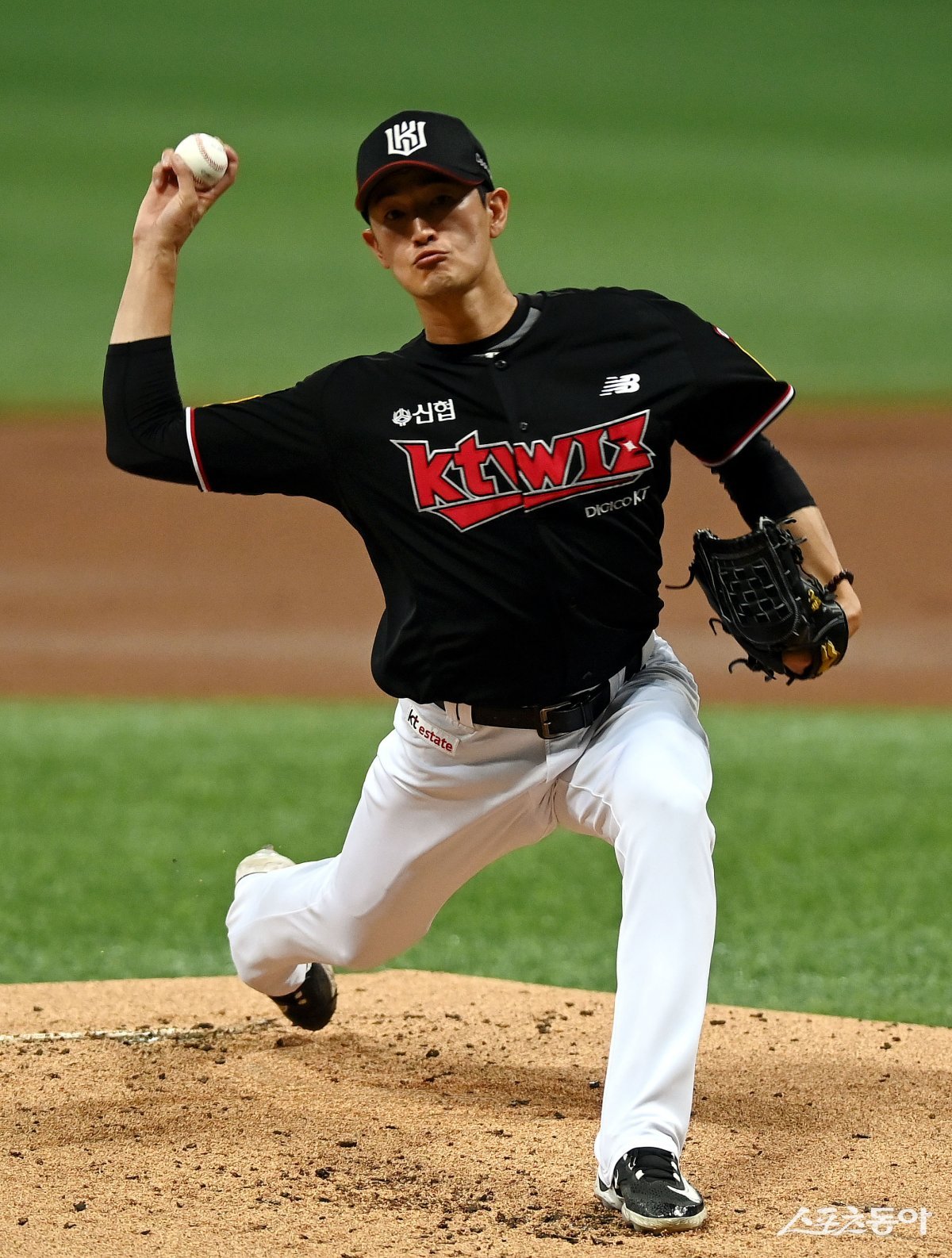 13일 서울 고척스카이돔에서 ‘2023 신한은행 SOL KBO리그’ 키움 히어로즈와 kt 위즈의 경기가 열렸다. kt 선발투수 고영표가 힘차게 볼을 던지고 있다.