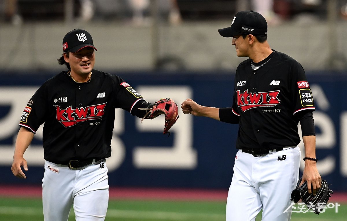 13일 서울 고척스카이돔에서 ‘2023 신한은행 SOL KBO리그’ 키움 히어로즈와 kt 위즈의 경기가 열렸다. 6회까지 키움 공격을 무실점으로 막은 kt 선발 고영표가 이닝 종료 후 김상수와 하이파이브를 나누고 있다.
