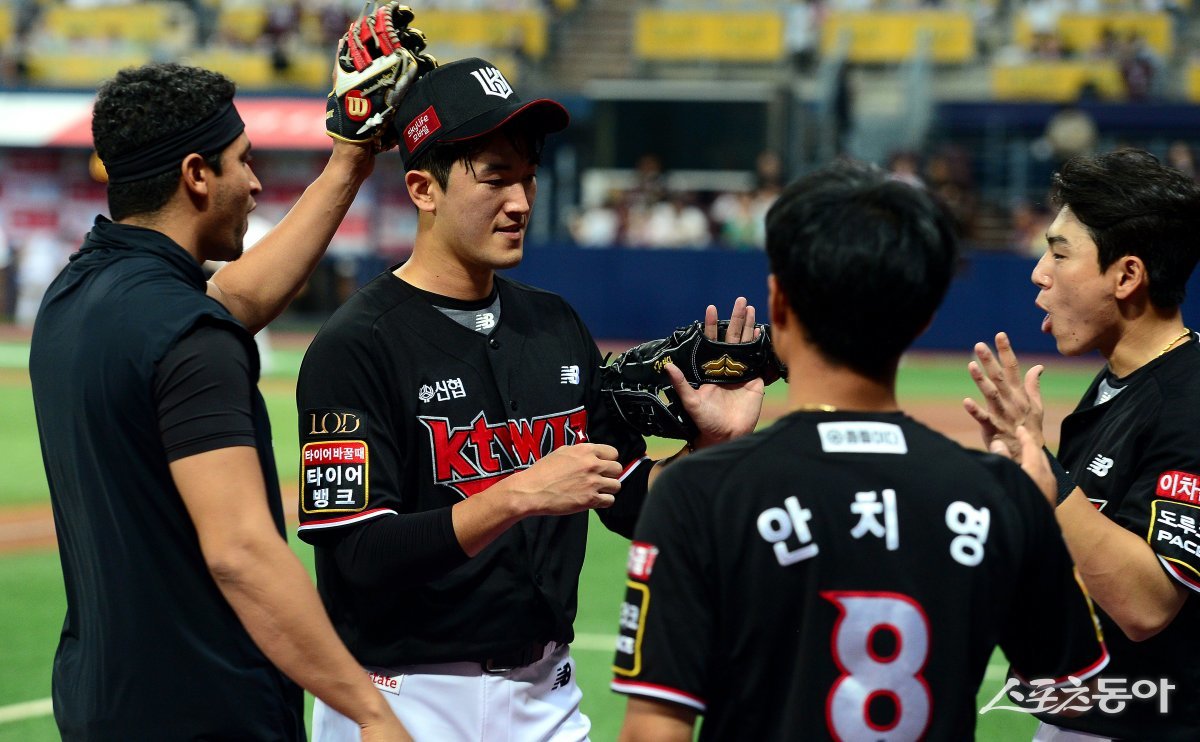 13일 서울 고척스카이돔에서 ‘2023 신한은행 SOL KBO리그’ 키움 히어로즈와 kt 위즈의 경기가 열렸다. 7회까지 키움 공격을 무실점으로 막은 kt 선발 고영표가 이닝 종료 후 동료들의 환영을 받고 있다.