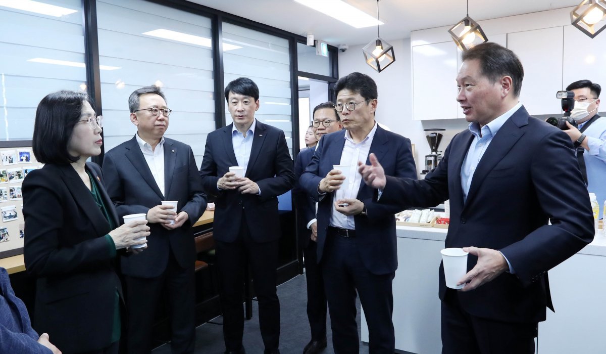 최태원(맨 오른쪽) SK그룹 회장이 4월 열린 ‘다함께 나눔프로젝트’ 행사에서 김현숙(맨 왼쪽) 여성가족부 장관 등과 위기청소년 지원 관련 환담을 나누고 있다. 사진제공|SK