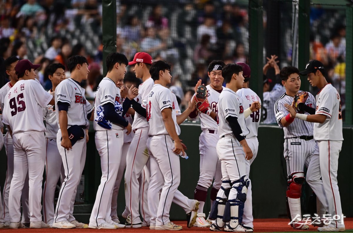 14일 부산 사직야구장에서 열린 ‘2023 신한은행 SOL KBO 퓨처스 올스타전’ 북부리그 올스타와 남부리그 올스타의 경기에서 3회초 무실점으로 수비를 마친 선수들이 기쁨을 나누고 있다.
