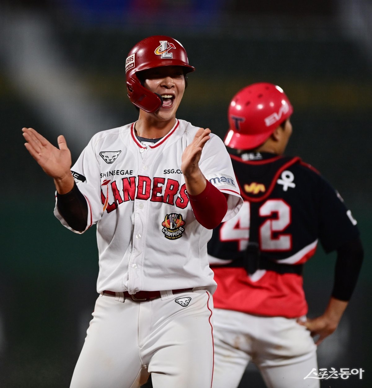 14일 부산 사직야구장에서 열린 ‘2023 신한은행 SOL KBO 퓨처스 올스타전’ 북부리그 올스타와 남부리그 올스타의 경기에서 7회말 1사 2루 북부 올스타의 우전 적시타 때 득점에 성공한 2루주자 김건이가 기뻐하고 있다.