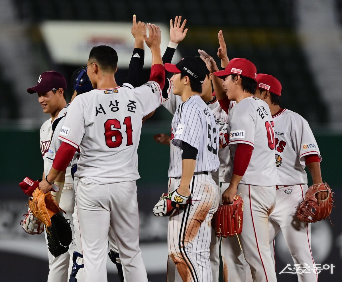 14일 부산 사직야구장에서 열린 ‘2023 신한은행 SOL KBO 퓨처스 올스타전’ 북부리그 올스타와 남부리그 올스타의 경기에서 9-7로 승리한 북부 올스타 선수들이 기쁨을 나누고 있다.