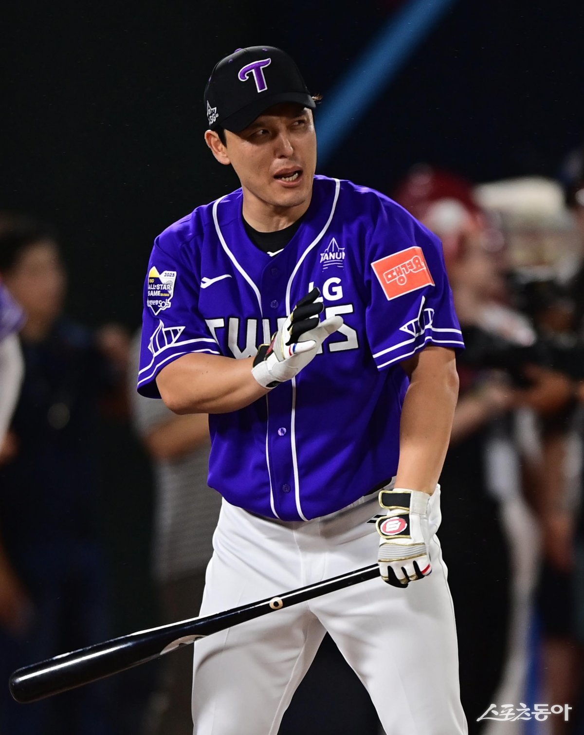 14일 부산 사직야구장에서 열린 ‘2023 신한은행 SOL KBO 올스타전’ 컴투스프로야구 홈런레이스에서 LG 박동원이 배팅볼 투수와 이야기를 하고 있다.