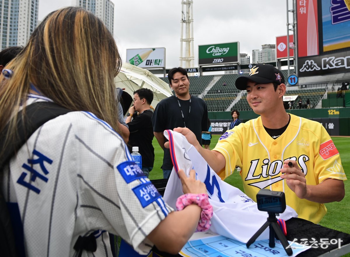 15일 부산 사직야구장에서 ‘2023 신한은행 SOL KBO 올스타전’ 드림 올스타와 나눔 올스타의 경기에 앞서 올스타 팬사인회가 열렸다. 삼성 구자욱이 팬에게 사인을 해주고 있다.