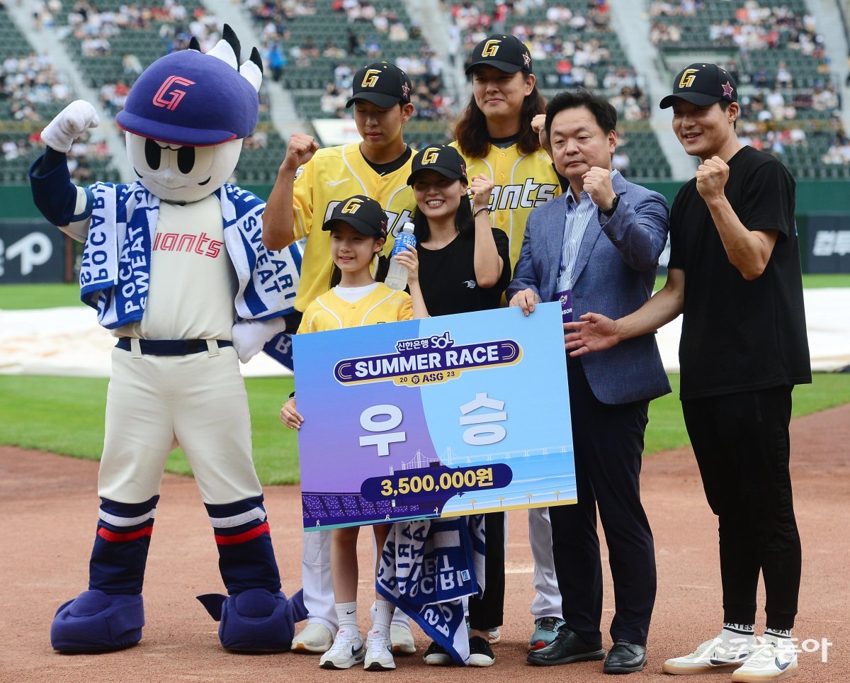 15일 부산 사직야구장에서 ‘2023 신한은행 SOL KBO 올스타전’ 드림 올스타와 나눔 올스타의 경기에 앞서 썸머레이스가 열렸다. 우승한 롯데 김민석과 김원중이 기념 촬영을 하고 있다.