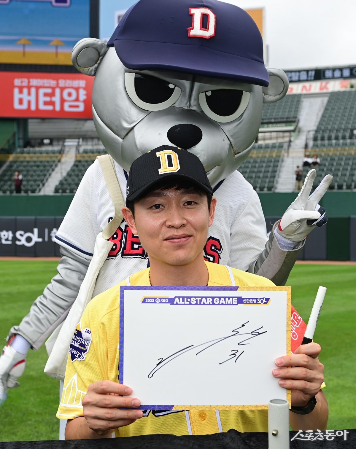 15일 부산 사직야구장에서 ‘2023 신한은행 SOL KBO 올스타전’ 드림 올스타와 나눔 올스타의 경기에 앞서 올스타 팬사인회가 열렸다. 두산 정수빈이 포즈를 취하고 있다.