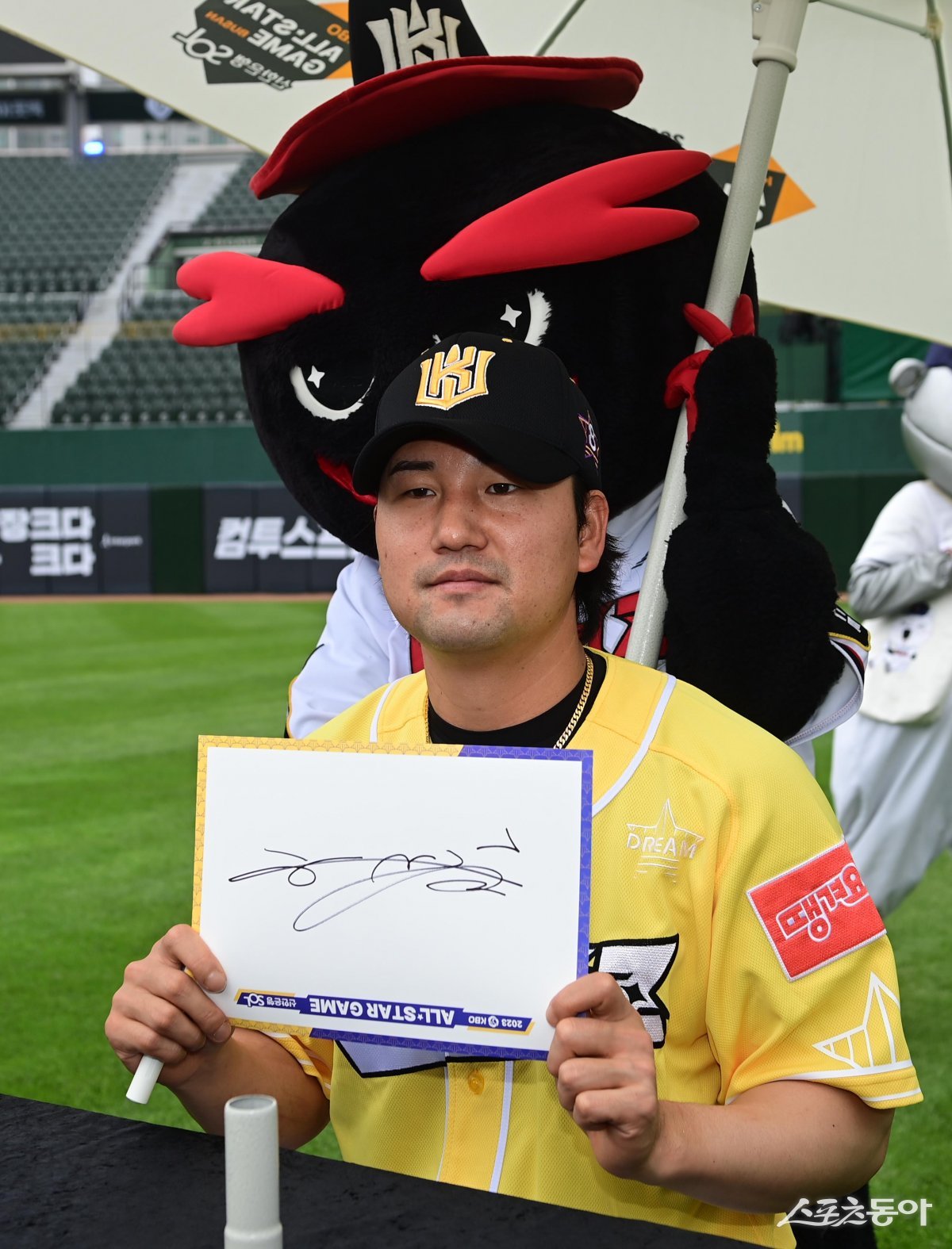 15일 부산 사직야구장에서 ‘2023 신한은행 SOL KBO 올스타전’ 드림 올스타와 나눔 올스타의 경기에 앞서 올스타 팬사인회가 열렸다. KT 김상수가 포즈를 취하고 있다.