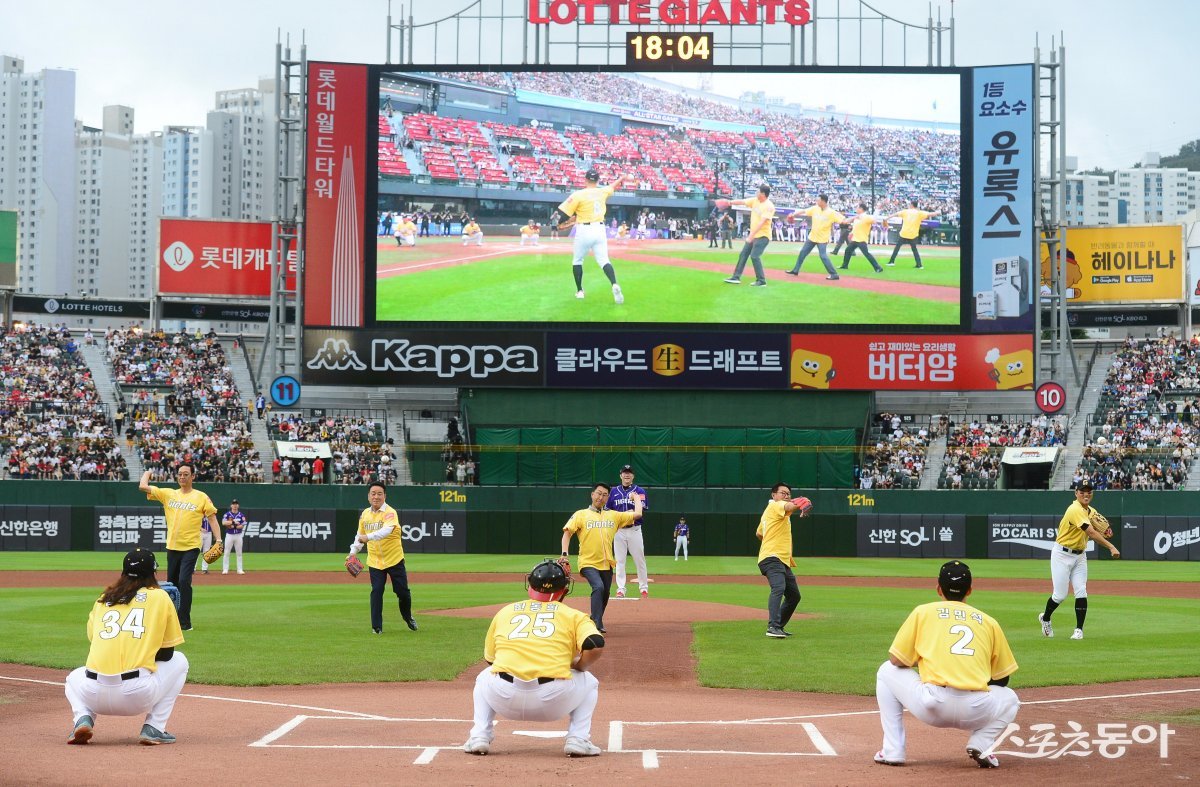 15일 부산 사직야구장에서 열린 ‘2023 신한은행 SOL KBO 올스타전’ 드림 올스타와 나눔 올스타의 경기에서 롯데 자이언츠에서 올스타 최우수선수를 차지한 김용희, 허규옥, 김민호, 김응국, 전준우가 시구를 하고 있다.