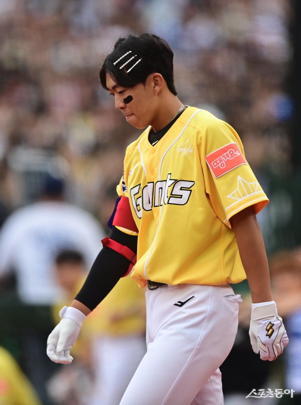 15일 부산 사직야구장에서 열린 ‘2023 신한은행 SOL KBO 올스타전’ 드림 올스타와 나눔 올스타의 경기에서 3회초 1사 1루 드림 김민석이 타석에 오르며 세리머니를 준비하고 있다.