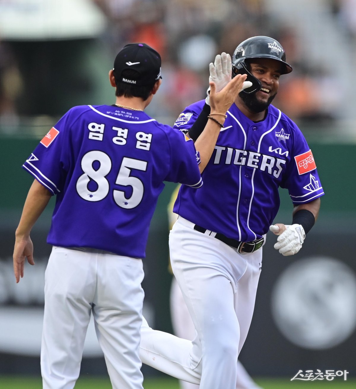 15일 부산 사직야구장에서 열린 ‘2023 신한은행 SOL KBO 올스타전’ 드림 올스타와 나눔 올스타의 경기에서 1회말 1사 1, 2루 나눔 소크라테스가 좌월 3점 홈런을 친 후 3루코치와 하이파이브를 하고 있다.