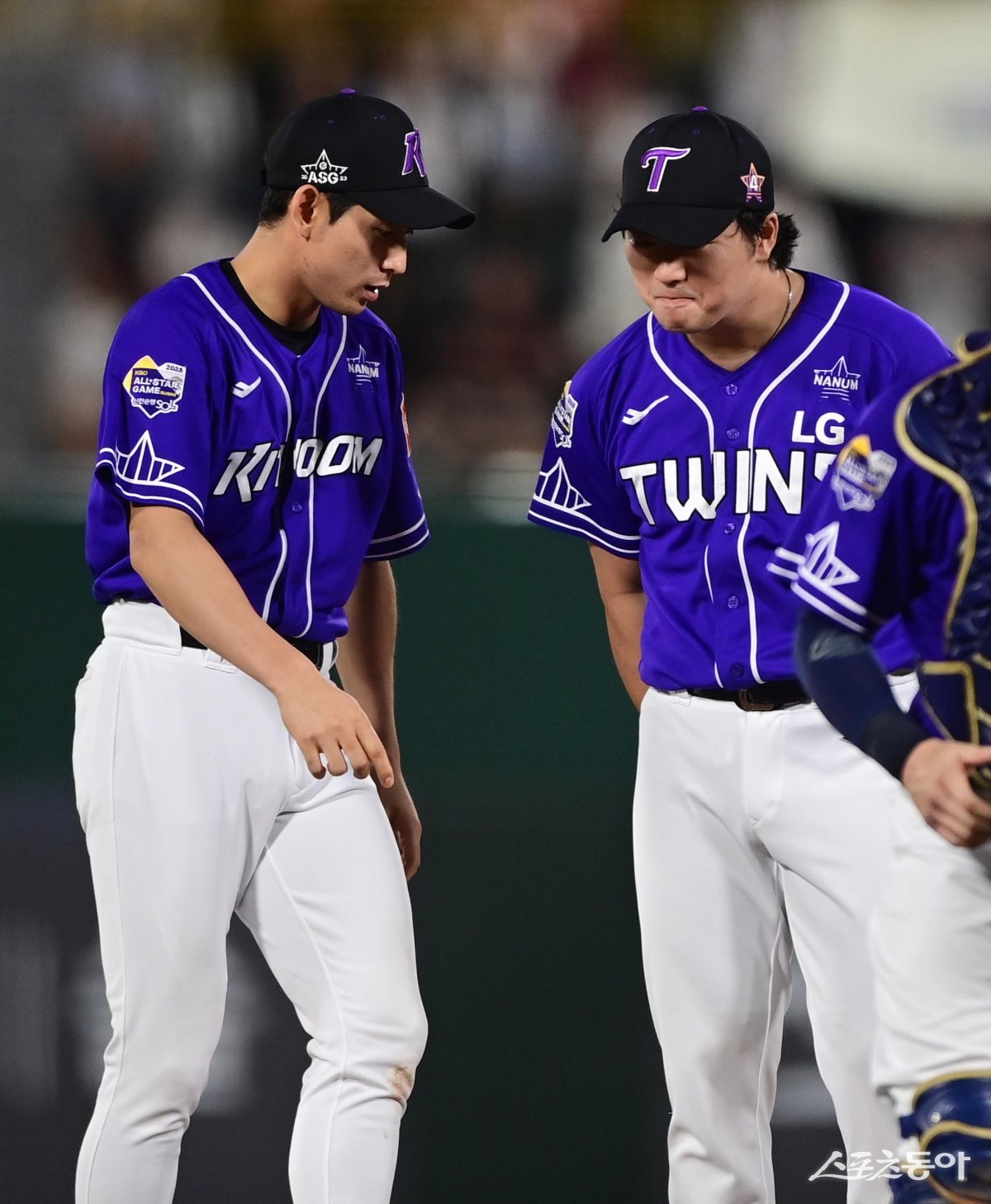 15일 부산 사직야구장에서 열린 ‘2023 신한은행 SOL KBO 올스타전’ 드림 올스타와 나눔 올스타의 경기에서 9회초 2사 1, 3루 상황에서 나눔 이정후가 고우석의 투수 교체를 진행하고 있다.