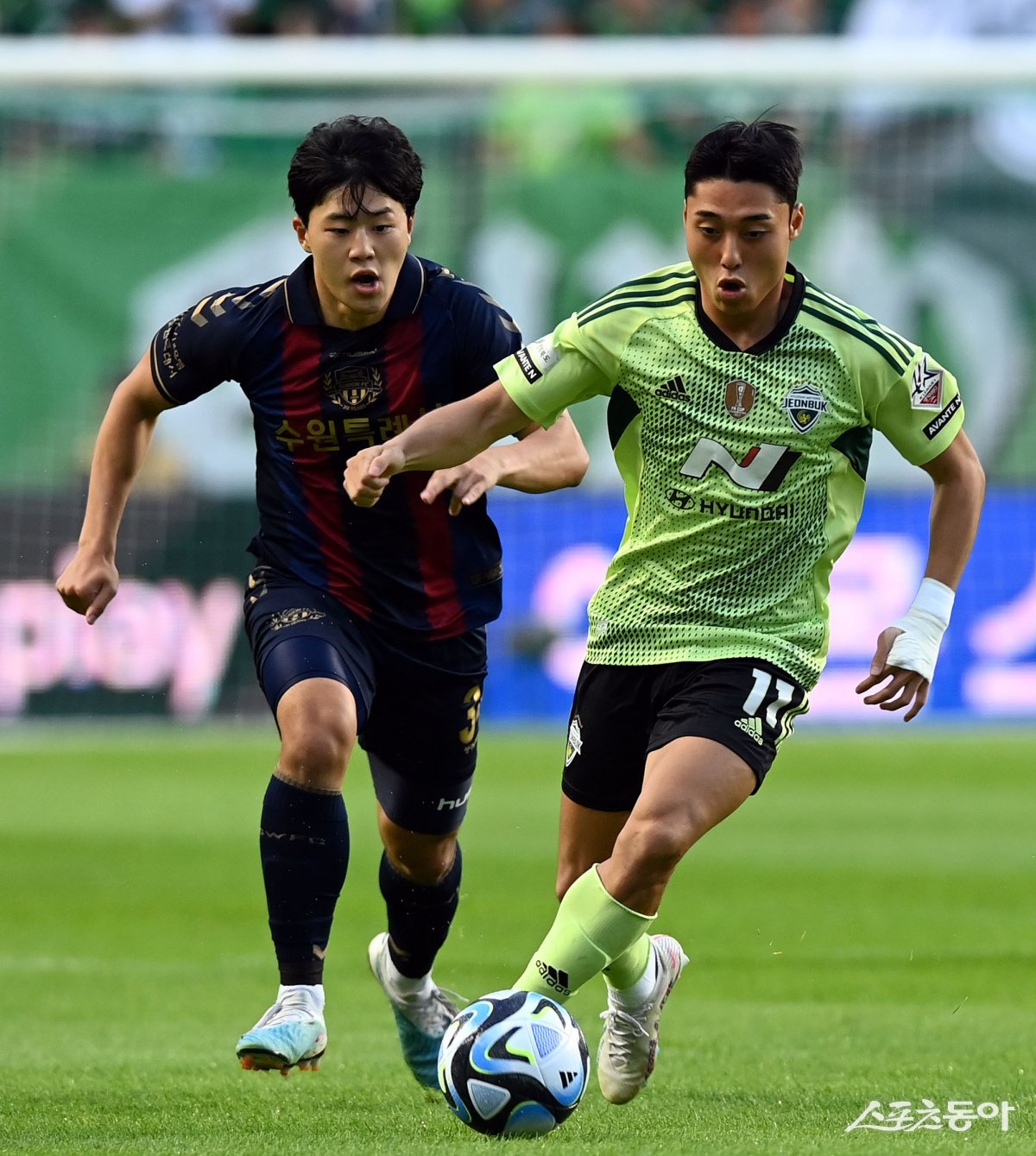 16일 전주월드컵경기장에서 열린 ‘하나원큐 K리그1 2023’ 전북 현대와 수원FC의 경기에서 전북 이동준이 수원FC 수비를 제치며 돌파하고 있다.