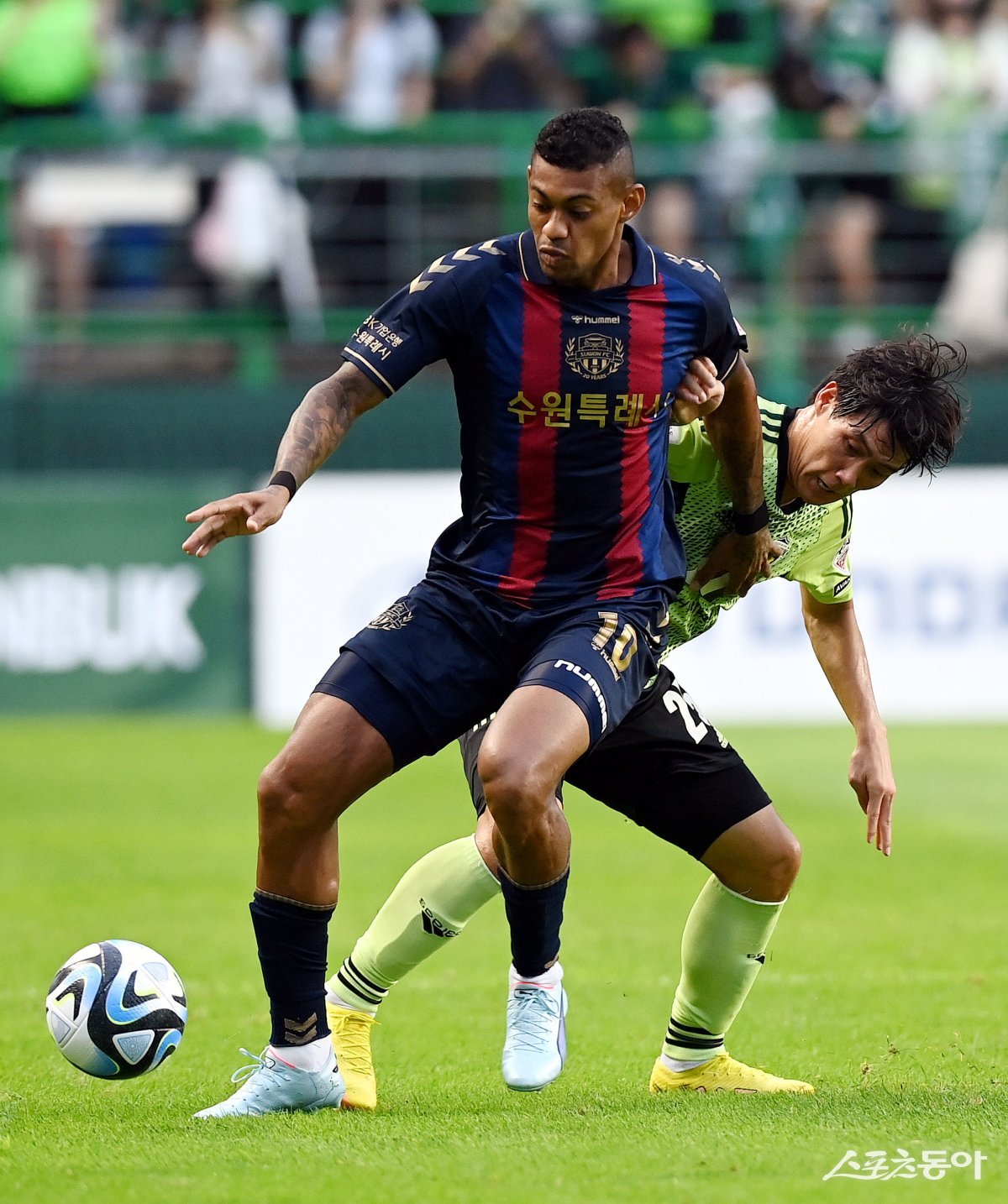 16일 전주월드컵경기장에서 열린 ‘하나원큐 K리그1 2023’ 전북 현대와 수원FC의 경기에서 수원FC 로페즈가 전북 최철순과 볼 다툼을 벌이고 있다.
